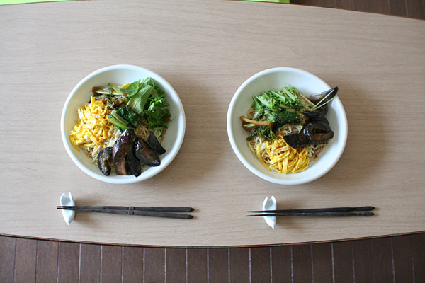 夏は当然「冷やし中華」 July 16, 2008 / diary 「麺」大好きです。 休日のお昼ご飯は麺をリクエスト、夏は当然「冷やし中華」。茄子、小松菜、水菜、セロリ、卵焼きの隊長オリジナル。サラダみたいな冷やし中華をもりもり食べます。 具はやっぱりご家庭それぞれ、みなさんは何を入れてますか?